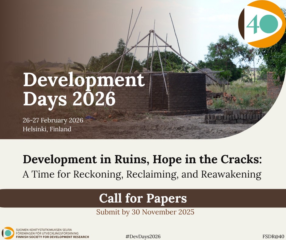 Coinciding with the 40th anniversary of the Finnish Society for Development Research, the #DevDays2026 international conference calls on scholars, practitioners, and activists to share their studies, reflections, advocacies, and experiences in engaging this dialectic of ruin and hope. We ask: How do we reckon with the ruins of development? How do we learn from, and nurture, the cracks where hope takes root? And how do we reawaken political consciousness for socio-ecological and economic-cultural transformation?